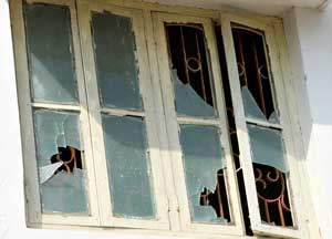 কংগ্রেস প্রার্থীর বাড়ির জানলার ভাঙা কাচ। অভিযোগ, তৃণমূলের লোকজনের ছোড়া ইটেই ওই কাচ ভাঙে। বুধবারের নিজস্ব চিত্র।