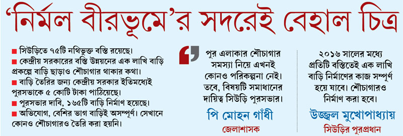 দেশকে ‘নির্মল’ করতে হবে। তার জন্য প্রচার চলছে জোরকদমে। সরকারি ভর্তুকিতে জায়গায় জায়গায় বসছে শৌচাগার। অথচ আজকের দিনেও শৌচকর্মের জন্য ওঁদের ছুটতে হচ্ছে বিভিন্ন পুকুর পাড়ে বা নর্দমার ধারে। না, এই ঘটনা প্রান্তিক কোনও গ্রামের নয়। খোদ জেলার সদর শহর সিউড়িতেই বছরের পরে বছর এমনই অভিজ্ঞতা বাসিন্দাদের।
