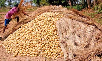 দর ওঠার অপেক্ষায় ওন্দার তপোবনে আলুর স্তূপে খড় চাপা দেওয়া হচ্ছে।