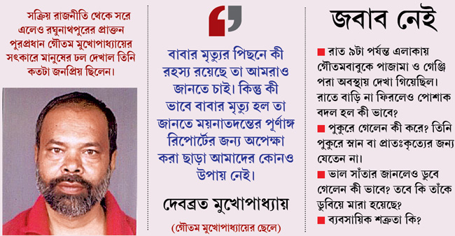 শনিবার সন্ধ্যায় বাঁকুড়া রাস্তার পাশের শ্মশানে রঘুনাথপুরের প্রাক্তন পুরপ্রধান গৌতম মুখোপাধ্যায়ের শেষকৃত্য সম্পন্ন করা হয়। সেখানে যোগ দিতে যাওয়া মানুষজনের নিজেদের মধ্যে আলোচনায় বার বার ঘুরে ফিরে উঠেছে এই প্রসঙ্গ। বিশেষত স্নান বা প্রাকৃতিক কাজে কখনও পুকুরে না যাওয়া গৌতমবাবুর দেহ কী ভাবে পুকুরের জলে ভেসে উঠল, তা নিয়ে অনেকেই প্রশ্ন তুলেছেন।