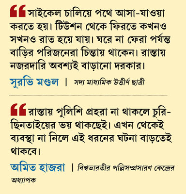 বিশ্বভারতীর পল্লিসম্প্রসারণ কেন্দ্রের অধ্যাপক অমিত হাজরা বলছেন, ‘‘রাস্তায় পুলিশি প্রহরা না থাকলে চুরি-ছিনতাইয়ের ভয় থাকছেই। এখন থেকেই ব্যবস্থা না নিলে এই ধরনের ঘটনা বাড়তেই থাকবে।’’ এলাকায় বাড়তে থাকা অপরাধের ঘটনা চিন্তায় ফেলেছে সদ্য মাধ্যমিক উত্তীর্ণ সুরভি মণ্ডলদেরও। সুরভির কথায়, ‘‘সাইকেল করে পথে আসা-যাওয়া করতে হয়। টিউশন থেকে ফিরতে কখনও সখনও রাত হয়ে যায়। ঘরে না ফেরা পর্যন্ত বাড়ির পরিজনেরা চিন্তায় থাকেন।’’ এই পরিস্থিতিতে এমন ব্যস্ত রাস্তায় পুলিশি নজরদারি বাড়ানোর আর্জি জানিয়েছেন বাসিন্দারা।