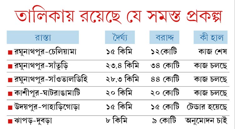 ইতিমধ্যেই রঘুনাথপুর-চেলিয়ামা রাস্তা নতুন ভাবে তৈরির কাজ শেষ হয়েছে। এ বার মহকুমা এলাকার পাঁচটি রাস্তার আমূল সংস্কারের কাজ শুরু হয়েছে। পূর্ত দফতর সূত্রের খবর, সম্প্রতি ৩৪ কোটি টাকা ব্যয়ে শুরু হয়েছে রঘুনাথপুর-সাঁতুড়ি রাস্তার কাজ। কাজ চলছে রঘুনাথপুর-সাঁওতালডিহি রাস্তারও। প্রায় সাড়ে ২৮ কিলোমিটার রাস্তার জন্য বরাদ্দ হয়েছে ৪৪ কোটি টাকা। ২০ কোটি টাকায় কাশীপুর থেকে ঘাটরাঙামাটি সাড়ে ২০ কিলোমিটার রাস্তা সংস্কারের জন্য দরপত্র আহ্বান করে সম্প্রতি কাজ শুরু হয়েছে।