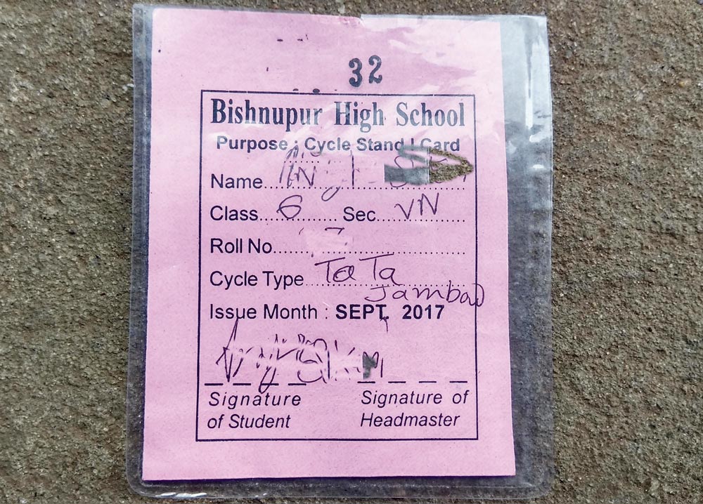 শুক্রবার স্কুলে গিয়ে দেখা গেল, দু’টি সাইকেল স্ট্যান্ডে সাইকেল রাখছে অনেক পড়ুয়া। তাদের প্রত্যেককে টাকা দিয়ে কার্ড নিতে হয়েছে। তবে তাতে প্রধান শিক্ষকের সইয়ের জায়গাটা ফাঁকা। স্ট্যান্ডের দেওয়ালে লেখা রয়েছে, ২০১১ সালে পুরসভার আর্থিক সাহায্যে সেটি তৈরি হয়েছে। দেখা গেল, প্রতি স্ট্যান্ডে এক জন করে যুবক ছড়ি হাতে সাইকেল রাখা তদারক করছেন। আর এক জন রসিদ পরীক্ষা করে দেখছেন, পড়ুয়ারা কে কোথায় সাইকেল রাখবে তা তদারক করছেন। এক জন দেখছেন রসিদের ব্যাপারটা— যাতে কেউ ফাঁক গলে ঢুকে পড়তে না পারে।