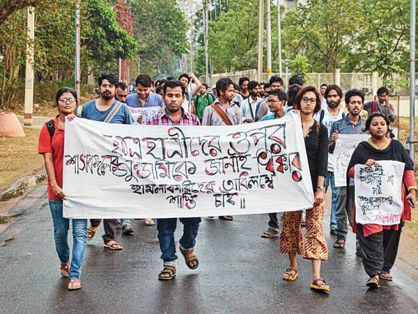 ধিক্কার: পড়ুয়াদের মারধরের প্রতিবাদে বিশ্বভারতীর পড়ুয়াদের মিছিল। ছবি: বিশ্বজিৎ রায়চৌধুরী