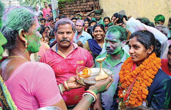 রাজনৈতিক নেতারা ছাড়া কাউকে নিয়ে এতটা মাতামাতি অনেকদিন দেখেনি পুরুলিয়া। পুরুলিয়া স্টেশন থেকে মেয়েটাকে নিয়ে সেই যে জনউন্মাদনা শুরু হয়েছিল, শহর ঘুরে তা শেষ হল মফস্সল থানার মাঙ্গুরিয়া গ্রামে গিয়ে। চারদিকে শুধু একটাই স্লোগান— পুরুলিয়ার সোনার মেয়ে সোমা কর্মকার স্বাগতম।