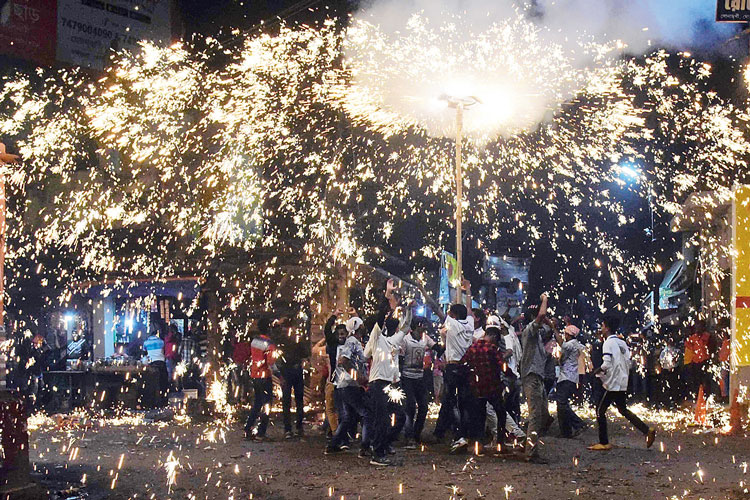 ফাটছে কদমঝাড়। বৃহস্পতিবার রাতে সোনামুখীর চৌমাথায়। নিজস্ব চিত্র