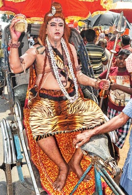 উৎসব: বাঁকুড়ার এক্তেশ্বরে রিকশায় চড়ে এলেন ‘মহাদেব’। ছবি: শুভ্র মিত্র ও অভিজিৎ সিংহ