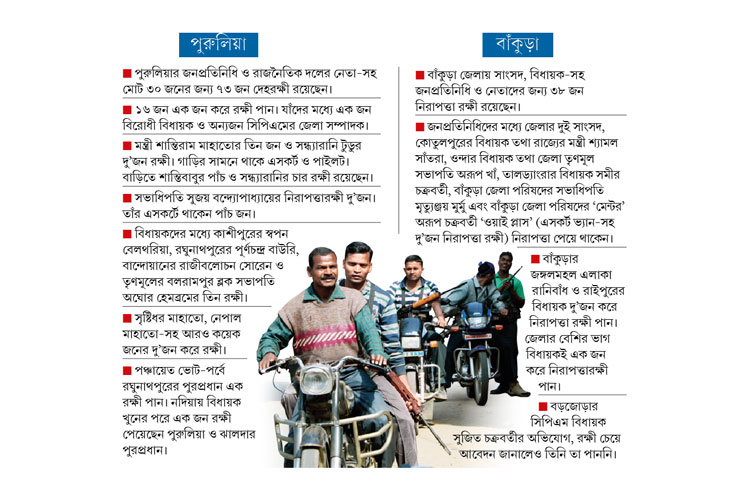 যদিও জেলা পুলিশের এক কর্তা বলেন, “জনপ্রতিনিধিরা নিজেদের রক্ষীদের চাইলেই ছুটি দিতে পারেন না। সে ক্ষেত্রে রক্ষীদের পুলিশ সুপারের কাছে আবেদন করতে হয়।” বাঁকুড়ার পুলিশ সুপার কোটেশ্বর রাও বলেন, “রুটিন মাফিক নিরাপত্তারক্ষীদের প্রশিক্ষণ দেওয়া হয়। তখন সকলকেই নির্দেশ দেওয়া হয় ছুটি নিলে নিয়মনীতি মেনে আবেদনের ভিত্তিতে নিতে হবে। নদিয়ার ঘটনার পরে আরও কড়া হয়েছি।” সিপিএমের কেন্দ্রীয় কমিটির সদস্য অমিয় পাত্রেরও এক জন রক্ষী রয়েছে। তিনি বলেন, “এক জন বা দু’জন নিরাপত্তা রক্ষী দিয়ে হাত গুটিয়ে বসে থাকলে হবে না। সারা রাজ্যের আইন-শৃঙ্খলা জনিত সমস্যার মেটানো গেলেই দুর্ঘটনা রোখা সম্ভব।”