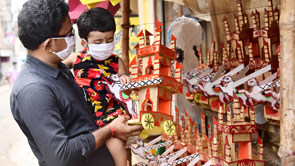 পছন্দ: পথে না নামলেও ঘরের ভিতরে ছুটবে রথ। সোমবার বিষ্ণুপুরের বাহাদুরগঞ্জে খুদের বাছাই। ছবি: শুভ্র মিত্র