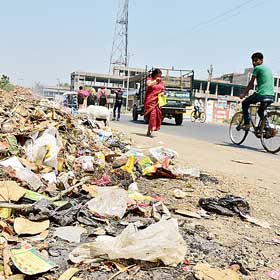 আবর্জনায় ঢেকেছে জাতীয় সড়কের একাংশ। দুর্গন্ধে চলা দায় পথচারীর। —নিজস্ব চিত্র।