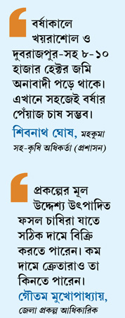 একই দাবি সিউড়ি সদর মহকুমার সহ কৃষি আধিকর্তা(প্রশাসন) শিবনাথ ঘোষেরও। তিনি বলেন, ‘‘প্রথমে যখন কৃষি বিপণনের সুফল বাংলা প্রকল্পের আওতায় এমন প্রস্তাব আসে তখন একটা কথা মাথায় ছিল। বর্ষাকালে খয়রাশোল ও দুবরাজপুর-সহ ৮-১০ হাজার হেক্টর জমি অনাবাদী পড়ে থাকে। এখানে সহজেই বর্ষার পেঁয়াজ চাষ সম্ভব। ‘এগ্রিফাউন্ড ডার্ক রেড’ নামে একটি পেঁয়াজের জাত ওখানে লাগানো হয়েছে। যে জাত তুলনায় অনেক বেশি জল সহ্য করতে পারে।’’