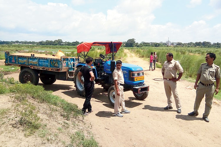 ময়ূরাক্ষী থেকে বালি তুলে আসার পথে আটক ট্রাক্টর। ছবি: কল্যাণ আচার্য