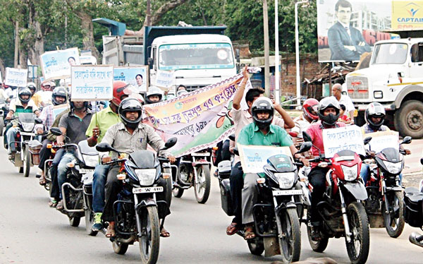 রঘুনাথপুরেও তৃণমূল কর্মীরা হেলমেট পরে র্যালি করলেন।