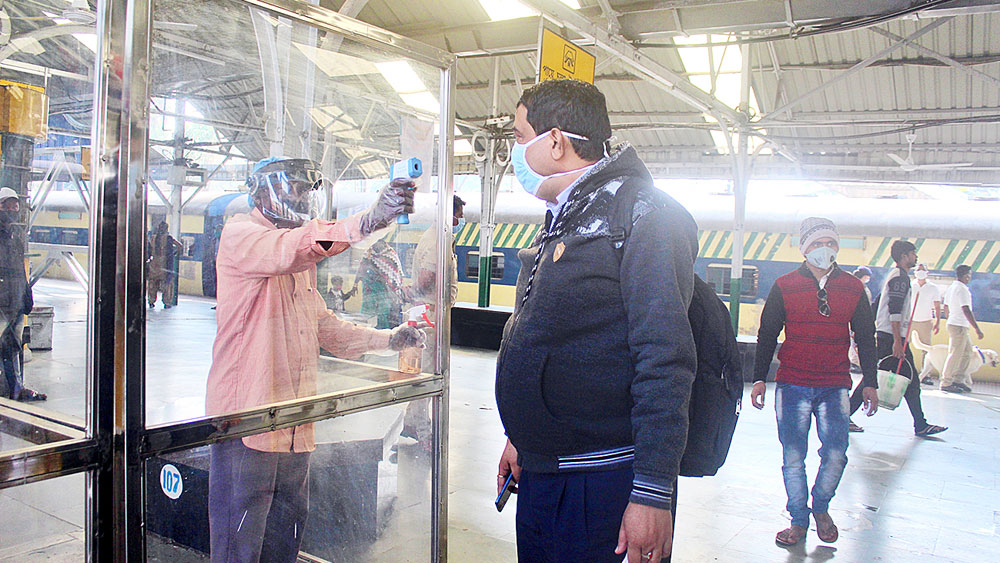 লোকাল ট্রেন থেকে নামা যাত্রীদের স্বাস্থ্য পরীক্ষা হচ্ছে। আদ্রা স্টেশনে সোমবার। নিজস্ব চিত্র