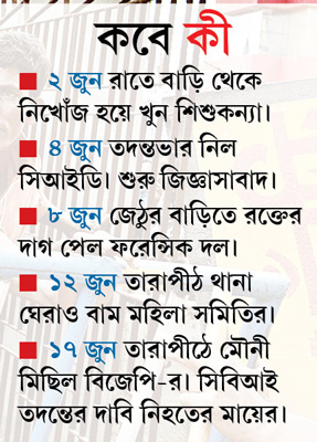 গত ৩ জুন রাতে তারাপীঠ থানা এলাকার একটি গ্রামে নিজের বাড়ি থেকেই নিখোঁজ হয়ে যায় ঘুমন্ত ওই শিশুকন্যাটি। রাতভর তল্লাশি চালানোর পরে মেয়েটির খোঁজ মেলে বাড়ির অদূরে মাঠের ধারে একটি অস্থায়ী খড়ের ছাউনি থেকে। প্রাথমিক তদন্ত পুলিশের অনুমান, ধর্ষণ করে খুন করা হয়েছে ওই নাবালিকাকে। খুনের পরে ছাউনিতে ফেলে দেওয়া হয় দেহটি। ঘটনার পরেই রামপুরহাটের বিধায়ক আশিস বন্দ্যোপাধ্যায় জানিয়েছিলেন, মুখ্যমন্ত্রী মমতা বন্দ্যোপাধ্যায় ওই ঘটনার তদন্তভার সিআইডি-কে দিয়েছেন। সিআইডি-র দল একাধিক বার গ্রামে গিয়ে ঘটনাস্থল পরিদর্শন করে। আলাদা করে জিজ্ঞাসাবাদ করেন নিহতের পরিবারের সদস্যদেরও। পরে গ্রামে তদন্তে গিয়েছে ফরেন্সিক দলও। কিন্তু, ঘটনার প্রায় এক মাসের মাথায় দাঁড়িয়েও খুনের কিনারা হয়নি। এখনও পর্যন্ত কেউ গ্রেফতারও হয়নি। তা নিয়েই ক্ষোভের পারদ চড়ছিল এলাকায়। সম্প্রতি বাম ও কংগ্রেস এবং পরে বিজেপি-র পক্ষ থেকে ওই ঘটনায় থানা ঘেরাও-সহ নানা কর্মসূচিও নেওয়া হয়। এ বার তদন্তে গাফিলতির প্রতিবাদে একজোট হলেন গ্রামবাসীও।