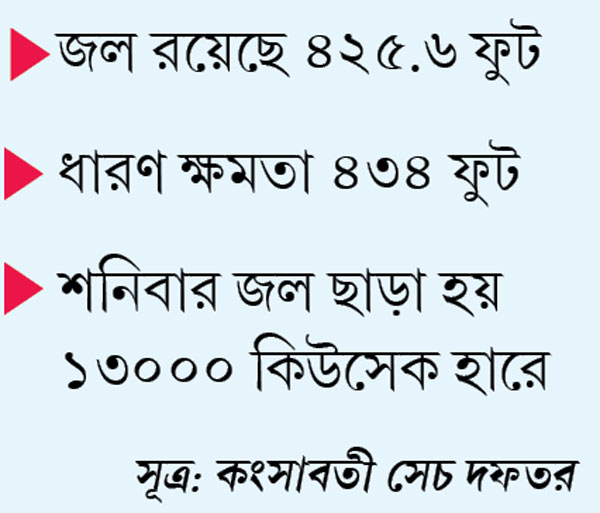 কিছু দিন আগেও ছবিটা ছিল অন্য রকম। গত সপ্তাহের নিম্নচাপে ভোল বদলেছে মুকুটমণিপুর জলাধারের। রুখাশুখা জলাধার ফুলেফেঁপে উঠেছে। কংসাবতী দফতর সূত্রে জানা গিয়েছে, এই মুহুর্তে জলাধারে প্রায় ৪২৫.৬ ফুট জল রয়েছে। জলাধারের ধারণ ক্ষমতা ৪৩৪ ফুট। কংসাবতী বিভাগের খাতড়া মহকুমা আধিকারিক সৌরভ দাস জানান, শনিবার ১৩ হাজার কিউসেক হারে জল ছাড়া হয়েছে। এর ফলে বেশ কিছু চাষ জমি সেচ খালের মাধ্যমে জল পেয়েছে বলে তিনি জানান। যদিও কংসাবতীর ছাড়া জলে কোথাও প্লাবন বা জনজীবন ব্যহত হয়নি বলেই প্রশাসনিক সূত্রে জানা গিয়েছে। বাঁকুড়া জেলাশাসক মৌমিতা গোদারা বসু বলেন, “কংসাবতীর ছাড়া জলে জনজীবন ব্যহত হওয়া বা কজওয়ে ডুবে রাস্তা বন্ধ হয়ে যাওয়ার খবর নেই।”