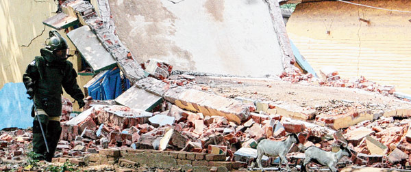 বিস্ফোরণস্থল ঘুরে দেখছেন বম্ব স্কোয়াডের কর্মী।