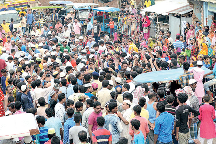 দোষীদের গ্রেফতার করার দাবিতে সিউড়ির স্টেশনবাজারে পথ অবরোধ। শনিবার। ছবি: তাপস বন্দ্যোপাধ্যায়