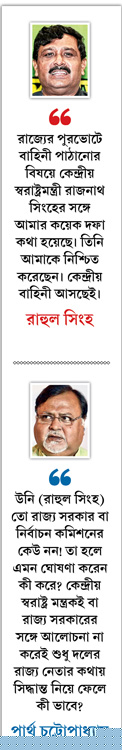 পুরভোটের মুখে সন্ত্রাসের অভিযোগ নিয়ে চাপানউতোর চলার মাঝেই শনিবার বহরমপুরে দলের জেলা কার্যালয়ে বিজেপি-র রাজ্য সভাপতি রাহুলবাবু বলেন, “রাজ্যের পুরভোটে কেন্দ্রীয় বাহিনী পাঠানোর বিষয়ে কেন্দ্রের স্বরাষ্ট্রমন্ত্রী রাজনাথ সিংহের সঙ্গে আমার কয়েক দফা কথা হয়েছে। কেন্দ্রীয় বাহিনী পাঠানোর বিষয়ে তিনি সহমত হয়েছেন। এ রাজ্যের পুরভোটের জন্য কেন্দ্রীয় বাহিনী পাঠানোর বিষয়ে তিনি আমাকে নিশ্চিত করেছেন। কেন্দ্রীয় বাহিনী আসছেই।” কত কোম্পানি বাহিনী আসবে, তা অবশ্য নির্দিষ্ট করে বলতে পারেননি রাহুলবাবু। বিজেপি সূত্রের খবর, কেন্দ্রীয় বাহিনী আসবে না জেনে শাসক দল যে ভাবে ‘বাড়াবাড়ি’ করছে, সেই বিপদের কথা রাজনাথকে বোঝাতে সক্ষম হয়েছেন রাহুলবাবুরা। তার পরেই মত বদলেছে। কিন্তু বিতর্ক বেধেছে এ ব্যাপারে প্রশাসনিক প্রক্রিয়া শুরু হওয়ার আগেই রাহুলবাবুর বিষয়টি প্রকাশ্যে নিয়ে আসায়।