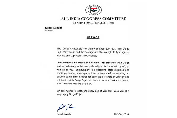 প্রদেশ কংগ্রেসের কমিটির উদ্দেশে লেখা ওই চিঠিতে রাহুল লিখেছেন, “আপনাদের সকলের সঙ্গে দুর্গা পুজোয় উৎসবে শামিল হতে কলকাতায় উপস্থিত থাকার ইচ্ছে ছিল। তবে দুর্ভাগ্যজনক ভাবে, এই মুহূর্তে আসন্ন রাজ্য বিধানসভা নির্বাচনের প্রস্তুতিতে ব্যস্ত থাকায় দিল্লি ছেড়ে কোথাও যাওয়া সম্ভব হচ্ছে না।” তবে এখনই কলকাতায় না আসতে পারলেও অদূর ভবিষ্যতে এ শহরে পা রাখার কথাও জানিয়েছেন রাহুল। রাজ্যবাসীকে শারদীয়ার শুভেচ্ছা জ্ঞাপন করেছেন তিনি। সেই সঙ্গে জোয় কলকাতায় আসতে না পারায় তাঁর আক্ষেপের কথাও বলেছেন রাহুল। তিনি জানিয়েছেন, যত দ্রুত সম্ভব কলকাতায় আসবেন এবং কংগ্রেস কর্মীদের সঙ্গে মিলিত হবেন।