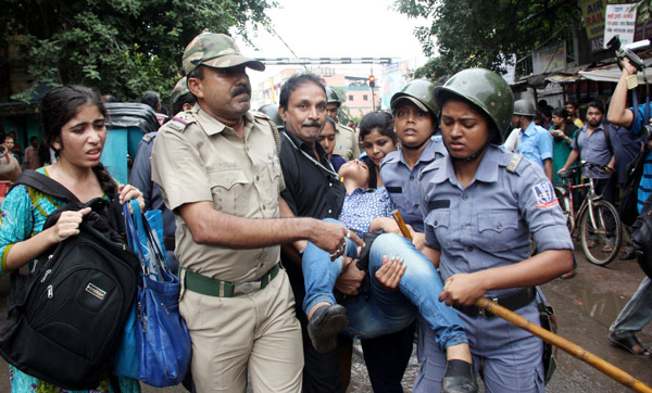 এর পরই পুলিশ কর্মীরা মহিলা যাত্রীদের জোর করে লাইনের উপর থেকে তুলে দেন। তাঁদের নিরাপত্তার বেষ্টনীতে ঘিরে প্ল্যাটফর্মের বাইরে নিয়ে যান তারা। আর সেই সময়েই বিপত্তি বাধে। পুরুষ সহযাত্রীরা এত ক্ষণ ধরে ওই অবরোধকারীদের উদ্দেশে কটূক্তি এবং গালিগালাজ করছিলেন। অভিযোগ, ভিড়ের ভেতর দিয়ে তাঁদের প্ল্যাটফর্মের বাইরে নিয়ে যাওয়ার সময় সেই যাত্রীরাই ওই মহিলাদের কারও কারও মাথায় চাটি মারেন। তাঁদের শাড়ি ধরে টানেন। এমনকী, পুলিশের হাত থেকে তাঁদের ছিনিয়ে নেওয়ার চেষ্টাও করেন বলে অভিযোগ। তাদের লক্ষ্য করে ছোড়া হয় পাথরও। এ সবের মধ্যেই পুলিশ কোনও মতে অবরোধকারীদের বাইরে নিয়ে যায়। আর তার পরেই ওই পুরুষ যাত্রীরা রেললাইনের উপর বসে পড়েন। শুরু হয় ফের অবরোধ।