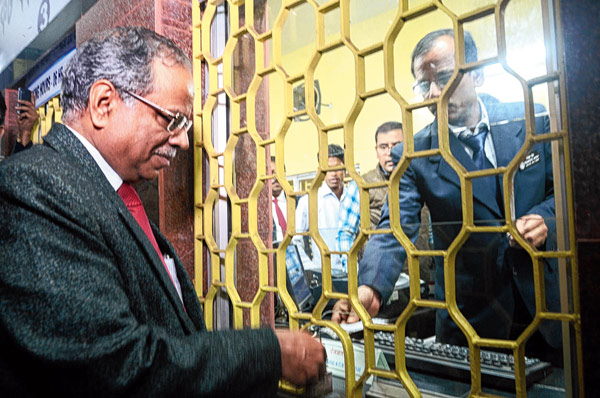হাবরায় টিকিট কাউন্টারের উদ্বোধনের পর প্রথম টিকিট কাটছেন জিএম আর কে গুপ্ত।