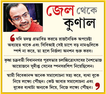 রজত যে দিন মুখ খুললেন, সে দিনও বিবৃতির ধারা অব্যাহত রেখেছেন কুণাল ঘোষ। তৃণমূলের সাসপেন্ডেড সাংসদ এ দিন জানিয়েছেন, সিবিআই দফতরের সামনে যাঁরা বিক্ষোভ করছেন, তাঁদের মধ্যে বিধাননগর পুরসভার চেয়ারপার্সন কৃষ্ণা চক্রবর্তী ওই পুরসভার চলচ্চিত্রোৎসবের নৈশভোজের আয়োজন করেন ই এম বাইপাস লাগোয়া একটি পাঁচতারা হোটেলে। সেই ভোজসভার পৃষ্ঠপোষক ছিলেন সুদীপ্ত সেন। এই ব্যাপারে গোটা শহরে যে সব হোর্ডিং দেওয়া হয়েছিল, তার অনেকটারই খরচ বহন করেছিল সারদা। কৃষ্ণাদেবীর স্বামী সমীর চক্রবর্তী ওরফে বুয়াকে কিছু বিষয়ে সিবিআই জিজ্ঞাসাবাদ করেছে। আর এ সব ঠেকাতেই কৃষ্ণাদেবী বিক্ষোভে সামিল হয়েছেন বলে অভিযোগ করেছেন কুণাল।