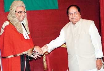 শপথ নিলেন অস্থায়ী রাজ্যপাল ডি ওয়াই পাটিল, হাইকোর্টের অস্থায়ী প্রধান বিচারপতি অসীম বন্দ্যোপাধ্যায়ের কাছে। ছবি: সুমন বল্লভ।