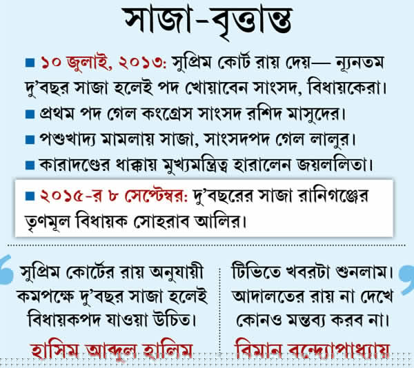 বিধানসভার স্পিকার বিমান বন্দ্যোপাধ্যায় এ দিন বলেছেন, ‘‘টিভিতে খবরটা শুনলাম। আদালতের রায় না-দেখে কোনও মন্তব্য করব না।’’ তবে, শীর্ষ আদালতের সেই রায়ের জেরে গোটা ভারতে ইতিমধ্যেই একাধিক জনপ্রতিনিধি পদ খুইয়েছেন। যাঁদের মধ্যে রয়েছেন আরজেডি নেতা লালু প্রসাদ যাদব। তামিলনাড়ুর মুখ্যমন্ত্রী পদ ছাড়তে হয়েছিল জয়ললিতাকেও। যদিও পরে উচ্চ আদালত থেকে বেকসুর খালাস পেয়ে তিনি ফের ক্ষমতায়।