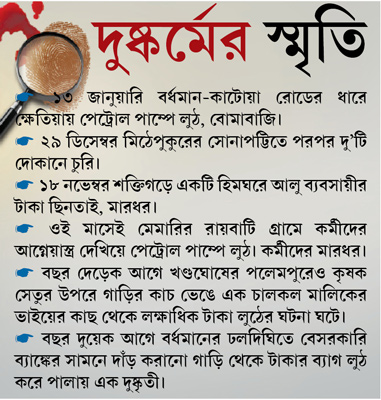 এর কয়েক পা দূরেই একটি বিয়েবাড়ি ও তার উপর গাড়িতে লগ্নিকারী সংস্থার অফিস রয়েছে। দুষ্কৃতীরা সেখানেও ঢুকে বিয়েবাড়ির দুই কর্মীকে মারধর করে। লগ্নিকারী সংস্থার দফতরে ঢুকেও তছনছ চালায়। তবে কোনও জায়গা থেকেই তেমন ‘সুবিধা’ করতে পারেনি দুষ্কৃতীরা। এ বার তারা হানা দেয় পেট্রোল পাম্পে। পাম্পের কর্মীরা জানান, দুষ্কৃতীদের কয়েকজনের মুখ বাধা ছিল, কয়েকজন খোলা মুখেই এসেছিল। ছ’জন হাতে পিস্তল আর এক জনের হাতে দো’নলা বন্দুক ছিল বলেও তাঁদের দাবি। কর্মীদের অভিযোগ, ‘‘ওরা ভিতরেই ঢুকে মাথায় পিস্তল তাক করে সিন্দুক খুলিয়ে টাকা লুঠ করে।’’ লক্ষাধিক টাকা খোওয়া গিয়েছে বলেও তাঁদের দাবি। পাম্পের আহত নৈশপ্রহরী, লোকোর বাসিন্দা শিশির ঘোষ জানান, দুষ্কৃতীদের পিছনে ধাওয়া করে গাড়ির নম্বর দেখার চেষ্টা করছিলেন তিনি। তখনই তাঁকে গুলি করা হয়। পেটে গুলি লাগায় রাস্তাতেই লুটিয়ে পড়েন তিনি। প্রথমে বর্ধমান মেডিক্যাল, সেখান থেকে একটি বেসরকারি নার্সিংহোমে ভর্তি করা হয় তাঁকে। সোমবার দুপরে ওই হাসপাতালে শিশিরবাবুর অস্ত্রোপচার হয়েছে। সেখানকার চিকিৎসকরা জানিয়েছেন, শিশিরবাবুর শরীর ভেদ করে গুলি বেরিয়ে গিয়েছিল।