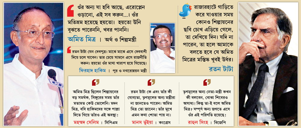 বুধবার দমদম বিমানবন্দর থেকে পূর্ব কলকাতার পাঁচতারা হোটেলে যাওয়ার পথে রাজারহাটে শিল্পায়নের কোনও ছবি নজরে পড়েনি রতন টাটার। সে কথা জানানোর ২৪ ঘণ্টার মধ্যেই তাঁকে বেনজির আক্রমণ করে রাজ্যের অর্থ ও শিল্পমন্ত্রী অমিত মিত্র বললেন, “ওঁর মতিভ্রম হয়েছে!” পুরমন্ত্রী ফিরহাদ হাকিমের মন্তব্য, “ওঁর মাথা খারাপ হয়ে গিয়েছে।”