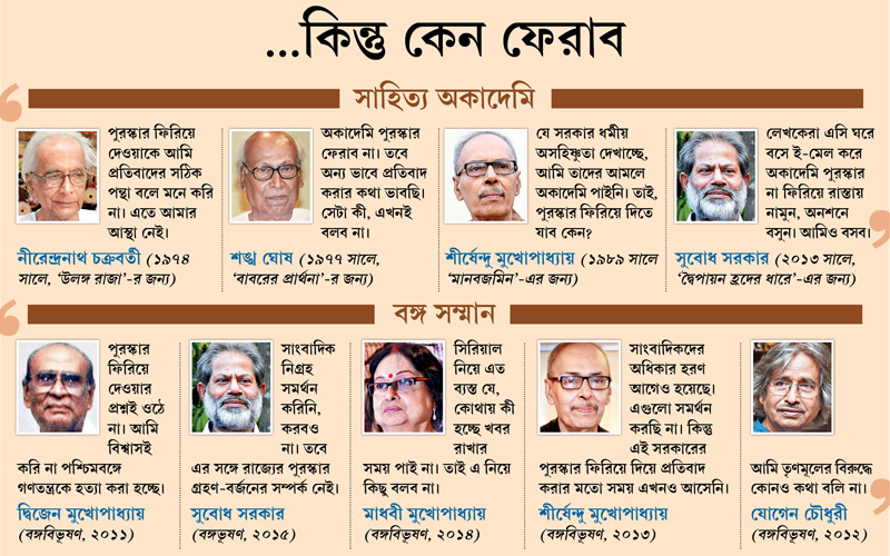 সাহিত্য অকাদেমি পুরস্কারপ্রাপ্ত কন্নড় লেখক এম এম কালবার্গির হত্যা বা উত্তরপ্রদেশের দাদরিতে সংখ্যালঘু সম্প্রদায়ের এক ব্যক্তিকে খুনের প্রতিবাদে এক-এক করে দেশের ২১ জন লেখক অকাদেমি পুরস্কার ফিরিয়ে দিয়েছেন। কিন্তু কেন্দ্রের বা রাজ্যের শাসকের বিরুদ্ধে প্রতিবাদ জানানোর পন্থা হিসেবে পুরস্কার বা সম্মান ফেরানোর কথা ভাবতে পারছেন না পশ্চিমবঙ্গের সাহিত্যিক-শিল্পীরা।