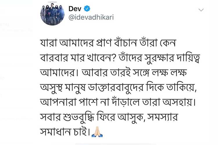 ডাক্তাররা কেন বার বার মার খাবেন? নিজের টুইটার হ্যান্ডলে এই প্রশ্নই তুলেছেন দেব। তিনি লেখেন, ‘‘যারা আমাদের প্রাণ বাঁচান, তাঁরা কেন বার বার মার খাবেন? তাঁদের সুরক্ষার দায়িত্ব আমাদের। আবার তারই সঙ্গে লক্ষ লক্ষ অসুস্থ মানুষ ডাক্তারবাবুদের দিকে তাকিয়ে, আপনারা পাশে না দাঁড়ালে তারা অসহায়। সবার শুভবুদ্ধি ফিরে আসুক। সমস্যার সমাধান চাই।’’ স্বস্তিকা, শুভশ্রী এবং ঋদ্ধি সেনও সোশ্যাল মিডিয়ায় রাজ্য জুড়ে সঙ্কটাপন্ন স্বাস্থ্য পরিষেবা নিয়ে নিজেদের মতামত জানিয়েছেন।