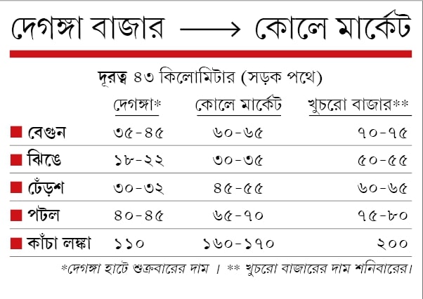 চাষিরা দাবি করছেন, তাঁরা লাভের মুখ দেখছেন না। তা হলে খুচরো বাজারে আসার পথে কোনও ফাঁকে দাম চড়ছে? দক্ষিণ ২৪ পরগনার পাইকারি আনাজ ব্যবসায়ী শ্রীপদ সরকারের দাবি, “গোলমালটা হচ্ছে ওই পরিবহণের জন্যই। দুই ২৪ পরগনার বিস্তীর্ণ এলাকার আনাজ আগে কলকাতায় আসত লোকাল ট্রেনে। তারপরে কোলে মার্কেট বা শহরতলির বাজারে পৌঁছে যেত। ট্রেন না-থাকায় সেই শৃঙ্খল পুরোপুরি ভেঙে পড়েছে। এখন আবার আনাজের জোগান কমায় ট্রাক ভরছে না। ফলে, পরিবহণ খরচ বাড়ছে।’’