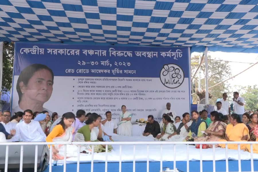 ধর্না মঞ্চে মমতা। নিজস্ব চিত্র।