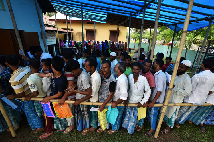 এনআরসি খসড়ায় নাম উঠেছে কিনা দেখতে লম্বা লাইন অসমের নওগাঁ জেলার একটি গ্রামে। ছবি: রয়টার্স