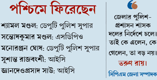 শাসক দল অবশ্য পুলিশের বদলি নিয়ে কোনও মন্তব্য করতে নারাজ। তৃণমূলের জেলা সভাপতি অজিত মাইতির কথায়, “এটা পুলিশের নিজস্ব ব্যাপার।”
