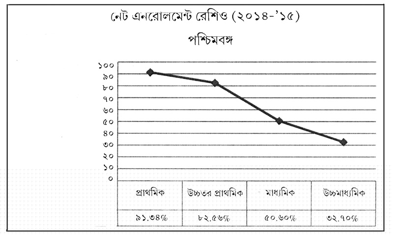 কেন্দ্রীয় সরকারের ‘ডাইস’ (২০১৪-’১৫) সমীক্ষা বলছে, শুধু পশ্চিমবঙ্গ নয়, বয়সভিত্তিক স্কুলে ভর্তির (নেট এনরোলমেন্ট রেশিও বা, এনইআর) হারে দেশের সব রাজ্যই কম-বেশি একই জায়গায় দাঁড়িয়ে রয়েছে। এর মানে, পশ্চিমবঙ্গ-সহ দেশের সব রাজ্যেই মেয়েদের অন্তত প্রাথমিক স্তরের স্কুলে পৌঁছে দেওয়া সম্ভব হলেও শিক্ষাজীবনের শেষ পর্যন্ত তাদের স্কুলে ধরে রাখা যাচ্ছে না। তারা স্কুল ছেড়ে দিচ্ছে। স্কুল ছাড়তে বাধ্য হচ্ছে।