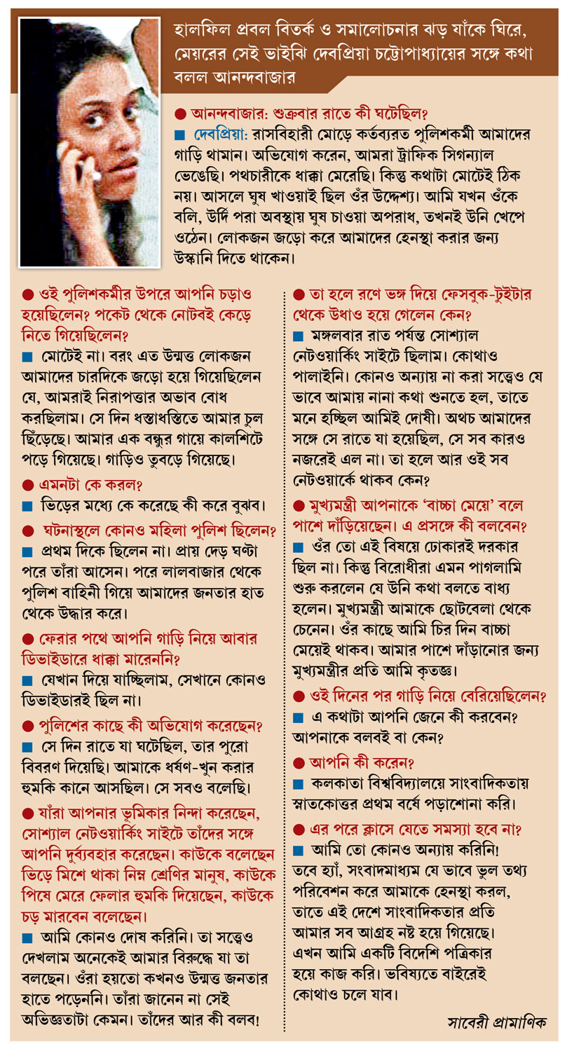 তার পরেও কিন্তু দেবপ্রিয়া ও তাঁর দুই বান্ধবীকে পুলিশ থানায় নিয়ে যায়নি। গাড়ির আরোহী দুই যুবককে থানায় নিয়ে যাওয়া হয়, মেয়েদের