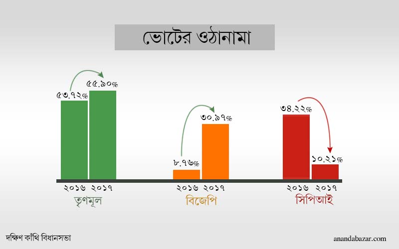 জয়ের ব্যবধান বাড়িয়ে নিয়েছে তৃণমূল। ‘অধিকারী গড়’ দক্ষিণ কাঁথিতে ২০১৬-র বিধানসভা নির্বাচনে তৃণমূলের জয়ের ব্যবধান ছিল ৩৪ হাজারের আশেপাশে। এক বছরের মাথায় সেই ব্যবধান বেড়ে পৌঁছল সাড়ে ৪২ হাজারে। কিন্তু চমকে দেওয়ার উপকরণ তৃণমূলের এই সাফল্যে নয়। আরও অনেক বেশি চমকে দিল বিজেপি। ৫২ হাজারেরও বেশি ভোট পেয়ে দক্ষিণ কাঁথিতে দ্বিতীয় স্থানে উঠে এল বিজেপি। বামেরা প্রায় ধূলিসাৎ। কংগ্রেসের অস্তিত্ব পৌঁছে গেল আনুবীক্ষণিক স্তরে।