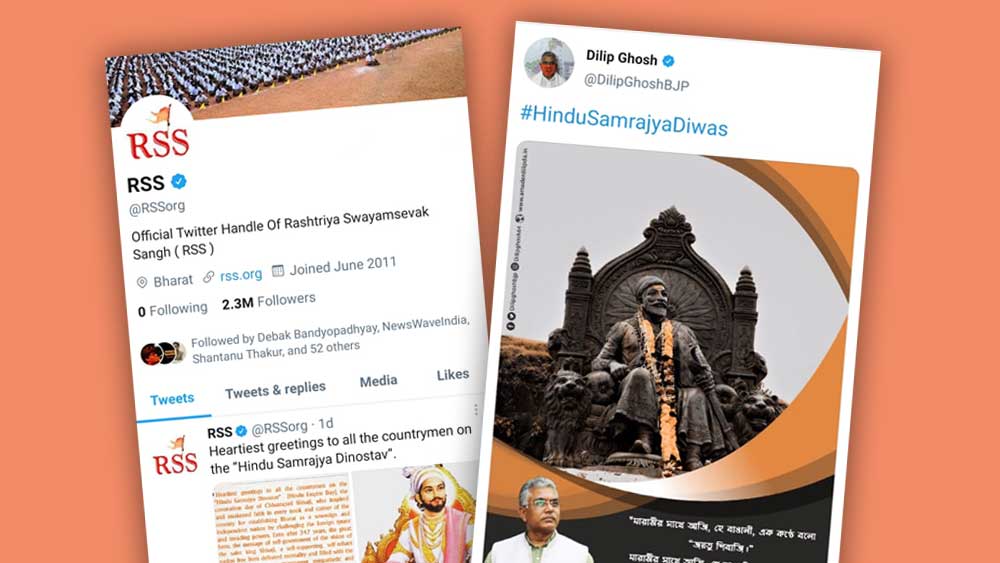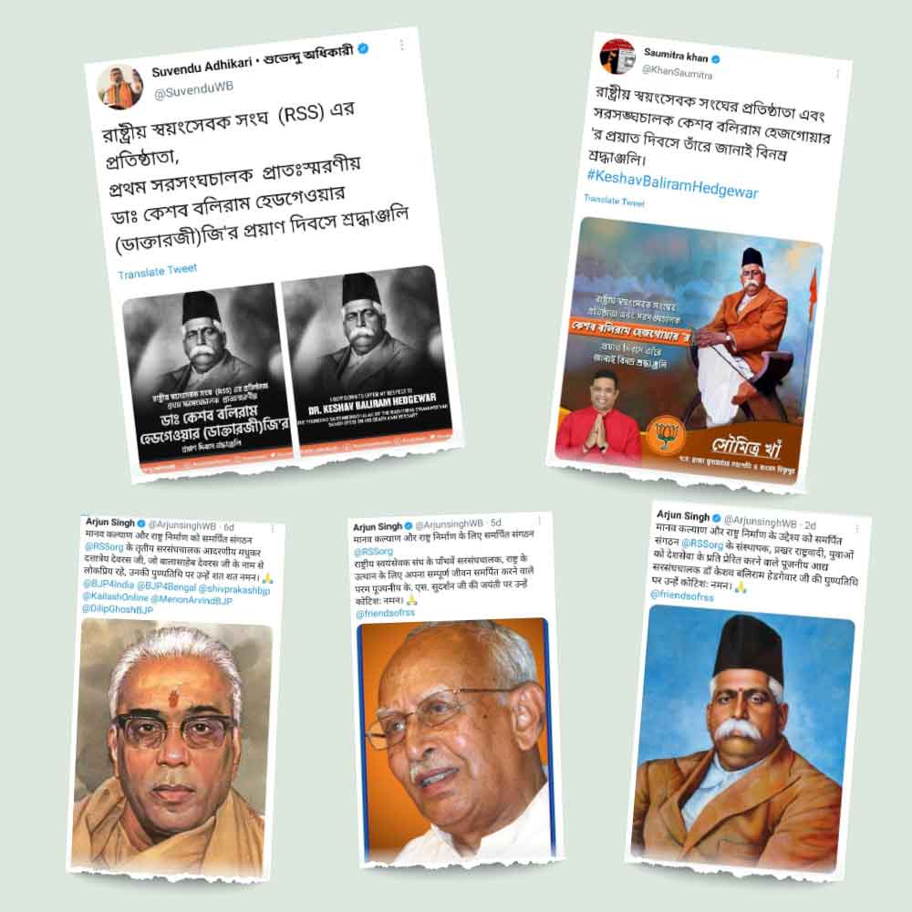 প্রসঙ্গত, আরএসএস বছরে যে ক’টি দিন উৎসব পালন করে, তার শুরু হয় চৈত্র শুক্ল প্রতিপদ তিথিতে। ওই দিন ‘বর্ষ প্রতিপদ’ অনুষ্ঠান পালন হয়। ওই দিনটিকে ‘হিন্দু নববর্ষ’ হিসেবে পালন করে আরএসএস। এর পর ‘হিন্দু সাম্রাজ্য দিবস’ পালিত হয় জ্যৈষ্ঠ শুক্লা ত্রয়োদশী তিথিতে। যা ছিল গত বুধবার, ২৩ জুন। সে দিন আরএসএস-এর টুইটার হ্যান্ডল থেকেও শিবাজির রাজ্যাভিষেক দিবস পালনের বার্তা দেওয়া হয়েছিল। বিজেপি-র রাজ্য সভাপতি দিলীপ ঘোষ আরএসএস-এর প্রাক্তন প্রচারক। বুধবার তিনিও ‘হিন্দু সাম্রাজ্য দিবস’ উপলক্ষে টুইট করেছিলেন। কিন্তু তা করতে দেখা যায়নি শুভেন্দু, অর্জুন বা সৌমিত্রকে। কিন্তু গত ২১ জুন হেডগেওয়ারের প্রয়াণদিবসে টুইট করেন তাঁরা। শুধু তা-ই নয়, কেউ কেউ সঙ্ঘের প্রাক্তন সরসঙ্ঘ চালকদের জন্মদিন, মৃত্যুদিনেও টুইট করছেন। যে প্রসঙ্গে রাজ্য বিজেপি-র এক নেতার বক্তব্য, ‘‘এঁরা কেন্দ্রীয় নেতৃত্বের নজরে আসার জন্য নিজেদের সঙ্ঘ অনুগামী প্রমাণ করতে গিয়ে সঙ্ঘের রীতিই ভাঙছেন।’’