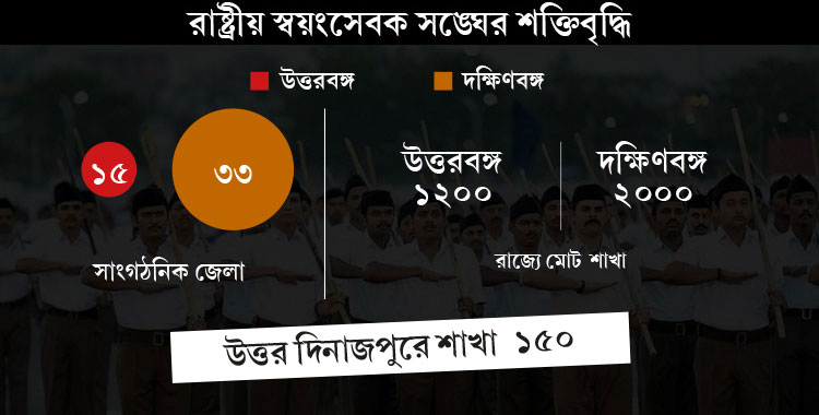 দক্ষিণবঙ্গের মতোই উত্তরে আরএসএস-এর শক্তিবৃদ্ধি হয়েছে। শুধুমাত্র উত্তর দিনাজপুরেই সঙ্ঘের ১৫০টি শাখা সক্রিয় ভাবে কাজ করছে বলে তাদের দাবি। ইসলামপুরের দাড়িভিট আগে থেকেই চষে রেখেছিল সঙ্ঘ। ফলে দাড়িভিট স্কুল-কাণ্ডে গুলিচালনার ঘটনার পর, মানুষের ক্ষোভের ফসল ঘরে তুলেছে বিজেপি। ইসলামপুর ছাড়াও গোয়ালপোখর, চাকুলিয়া, করণদিঘি, হেমতাবাদ— একাধিক এলাকা এখন সঙ্ঘের শক্ত ঘাঁটি।