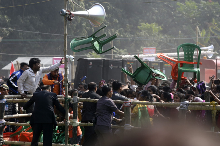 পুলিশ সূত্রে জানা গিয়েছে, এ দিন প্রধানমন্ত্রীর সভার জন্য গোটা মাঠটিকে পাঁচটি ভাগেভাগ করে জনতাকে বসানোর ব্যবস্থা করা হয়েছিল। মাঠের সামনের দিকে পাতা ছিল চেয়ার। প্রত্যক্ষদর্শীরা জানিয়েছেন, প্রধানমন্ত্রী মঞ্চে ওঠার পর থেকে পিছন থেকে ভিড়ের চাপ বাড়তে থাকায় তা এগোতে থাকে সামনের দিকে। তখনই মঞ্চের সামনের দিকে পাতা চেয়ার উঠিয়েফেলতে থাকে জনতা। শুরু হয় হুড়োহুড়ি এবং চেয়ার ছোড়া। সব মিলিয়ে পরিস্থিতি বেগতিক হয়ে ওঠে। তখনও মাঠের বাইরের রাস্তায় প্রবল ভিড়। সেই ভিড় মাঠের ভিতরে ঢোকার চেষ্টা করছে।