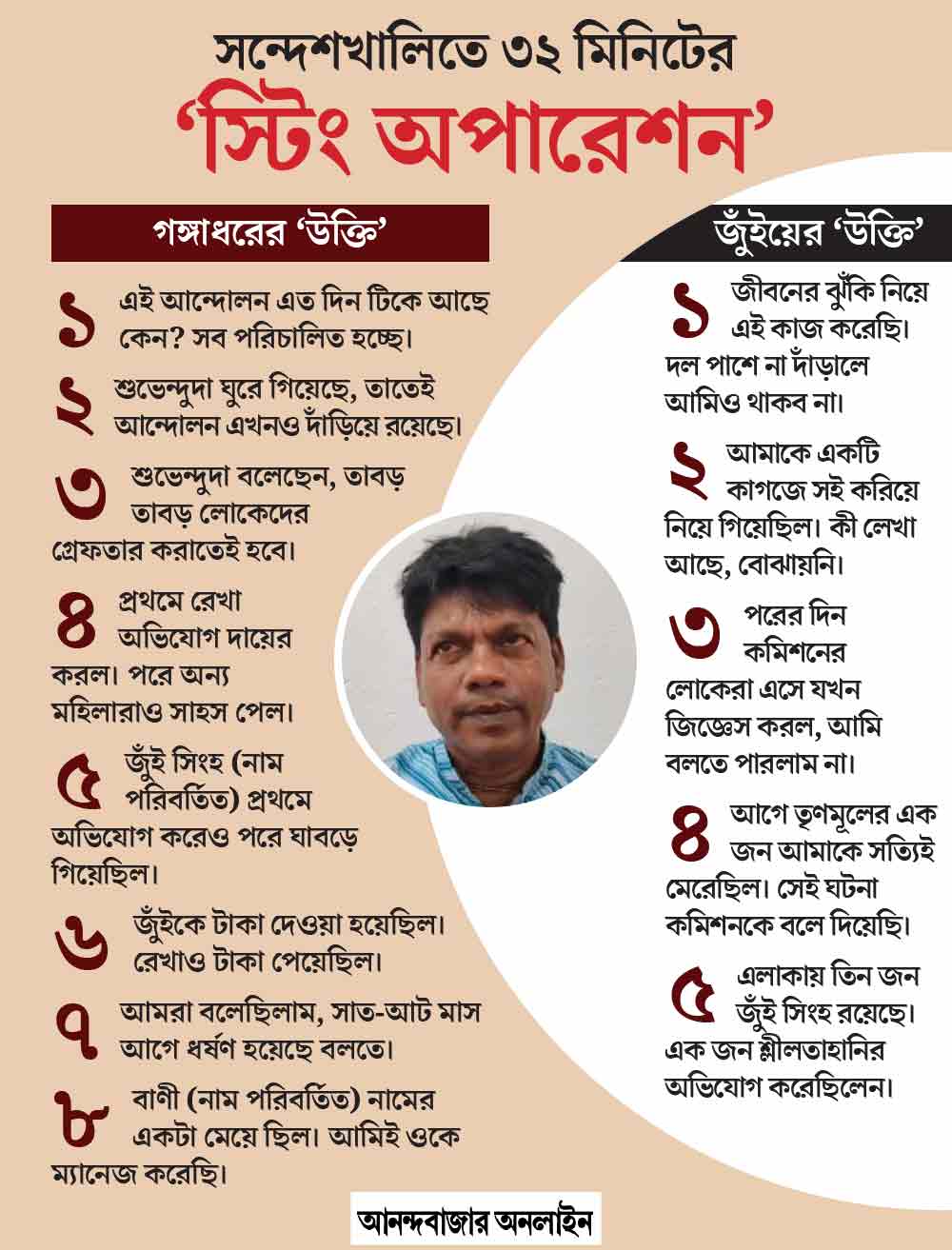 প্রকাশ্যে আসা স্টিং অপারেশনের ভিডিয়োয় দাবি করা হয়েছে, গঙ্গাধর সন্দেশখালি-২ ব্লকে বিজেপির ‘মণ্ডল সভাপতি’। স্থানীয় বিজেপি নেতৃত্ব অবশ্য তা মানতে রাজি নন। পদ্মের রাজ্য নেতারাও এ ব্যাপারে কিছু বলেননি। ভিডিয়োতে দেখা যাচ্ছে, গঙ্গাধর একটি ঘরে চেয়ারে বসে আছেন। কেউ বা কারা তাঁকে সন্দেশখালির ঘটনা নিয়ে প্রশ্ন করে চলেছেন। আড্ডার ছলে প্রশ্নকর্তাকে জবাব দিচ্ছেন গঙ্গাধর। সেই কথোপকথনে বার বার উঠে এসেছে শুভেন্দুর নাম। গঙ্গাধরকে বলতে শোনা গিয়েছে, ‘‘এই আন্দোলন (সন্দেশখালির আন্দোলন) এত দিন টিকে আছে কেন? তিনটে ছেলে এ দিক-ও দিক যাচ্ছে, গোটা বিষয়টা পরিচালনা করছে। শুভেন্দুদার আমাদের উপরে আস্থা আছে। শুভেন্দুদা এক বার ঘুরে গিয়েছে, তাতেই আন্দোলন এখনও দাঁড়িয়ে রয়েছে।’’ ভিডিয়োয় গঙ্গাধরের ‘স্বীকারোক্তি’, ‘‘শুভেন্দুদা টাকা আর মোবাইল ফোন দিয়ে গিয়েছেন। কারণ, এই ধরনের কাজ খালি হাতে হয় না।’’