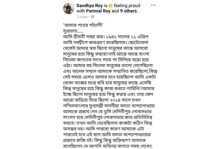 কেন সিনেমা থেকে রাজনীতিতে এসেছেন, সাংসদ হয়ে কী কী করেছেন, আগামী দিনের পরিকল্পনা— সবই রয়েছে সেই পাঁচালীতে। তবে ‘আমার পথের পাঁচালী’ শীর্ষক ওই ফেসবুক পোস্টের একটি অংশ নিয়ে রাজনৈতিক মহলে আলোচনা শুরু হয়েছে, যেখানে সন্ধ্যা সাংসদ হিসাবে তাঁর ভূমিকার কথা উল্লেখ করেছেন। সন্ধ্যা লিখেছেন, ‘আমার মেদিনীপুর লোকসভার বেশ কিছু সমস্যা মাননীয়া স্পিকার মহাশয়ার কাছে তুলে ধরেছিলাম। তার মধ্যে উল্লেখযোগ্য হল পোস্ট অফিস ডিজিটাল করা, কেশিয়াড়ি বিধানসভায় রেলপথ ব্যবস্থা চালু করা, কিছু দূরপাল্লার ট্রেন বেলদা এবং দাঁতন স্টেশনে দাঁড় করানো’।