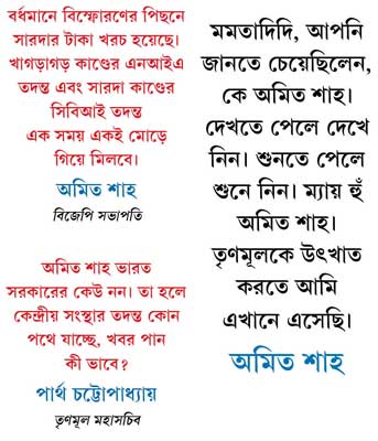 এ দিনের সভায় তিনি বলেন, “তৃণমূল মানে আগে ছিল মা-মাটি-মানুষ। সারদা তদন্ত যে পথে এগোচ্ছে, তাতে এখন তৃণমূলের তিন এম হয়েছে মদন-মুকুল-মমতা! আর ২০১৪ সালে বিএমবি, মানে ভাগ মদন ভাগ! ২০১৫ সালে হবে ভাগ মুকুল ভাগ! আর ২০১৬ সালে শেষ হবে ভাগ মমতা ভাগ!”
