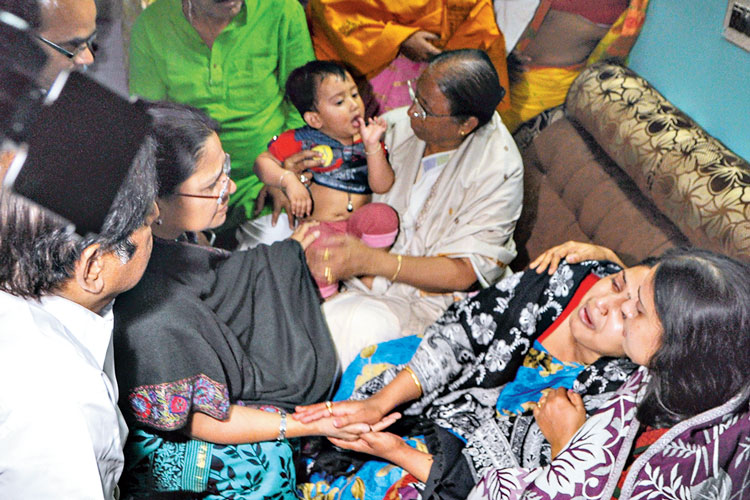 সত্যজিতের স্ত্রীকে সান্ত্বনা দিচ্ছেন মন্ত্রী জ্যোতিপ্রিয় মল্লিক ও সাংসদ মমতাবালা ঠাকুর। ছবি: প্রণব দেবনাথ