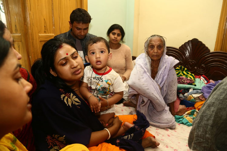 বাড়িতে ছেলেকে কোলে নিয়ে সত্যজিতের স্ত্রী।—নিজস্ব চিত্র।