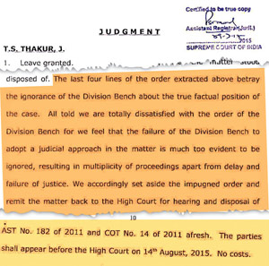 সুপ্রিম কোর্টের রায়ের কথা জেনে শিক্ষামন্ত্রী পার্থ চট্টোপাধ্যায় বলেছেন, ‘‘আমরা বলছি, কোনও বিশ্ববিদ্যালয়ে আর্থিক দুর্নীতি বরদাস্ত করা হবে না। তবে এ সব ব্যাপারে বিশ্ববিদ্যালয় কর্তৃপক্ষই চূড়ান্ত সিদ্ধান্ত নেবে।’’ বিশ্ববিদ্যালয়ের উপাচার্য সোমনাথ ঘোষ মন্তব্য করতে চাননি। ২০১০-এ তৎকালীন উপাচার্য অরুণাভ বসু মজুমদার পরীক্ষা নিয়ামক বিভাগের একটি অ্যাকাউন্ট থেকে কোটি টাকার বেশি নয়ছয়ের অভিযোগ পান। উপাচার্য মাটিগাড়া থানায় এফআইআর করে রেজিস্ট্রার দিলীপবাবুকে সাসপেন্ড করেন। দিলীপবাবু আবেদন করলে কলকাতা হাইকোর্টের সিঙ্গল বেঞ্চ তাঁর সাসপেনশনে স্থগিতাদেশ দেয়। বিশ্ববিদ্যালয় ডিভিশন বেঞ্চে যায়। ২০১১-তে ডিভিশন বেঞ্চ রায় দেয়, সিঙ্গল বেঞ্চে চূড়ান্ত রায় না হওয়া পর্যন্ত অভিযুক্তকে সবেতন ছুটি দিতে হবে। হাইকোর্টের এই রায়ের অংশ উদ্ধৃত করে সুপ্রিম কোর্ট বলেছে, তাতে মামলার যথাযথ ঘটনার সম্পর্কে ডিভিশন বেঞ্চের অজ্ঞতাই স্পষ্ট হয়েছে। হাইকোর্টের ব্যর্থতার জন্যই এই ঘটনায় বহু মামলা হয়েছে, বিচার বিলম্বিত হয়েছে। ওই রায় সম্পর্কে ‘‘সম্পূর্ণ অসন্তোষ’’ প্রকাশ করেন সুপ্রিম কোর্টের তিন বিচারপতি, টি এস ঠাকুর, আর কে আগরওয়াল এবং আর ভানুমতী।