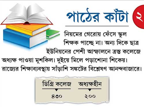 যার খেসারত দিচ্ছে রাজ্যের শিক্ষাক্ষেত্র। নিয়মের গেরোয় স্কুলে যেমন শিক্ষকের আকাল, তেমন ছাত্র সংসদের দৌরাত্ম্যে কলেজের অধ্যক্ষ বাড়ন্ত। বহু কলেজে যে সব ভারপ্রাপ্ত অধ্যক্ষ কিংবা টিচার-ইন-চার্জ কাজ সামলাচ্ছেন, তাঁদের অনেকেও দায়িত্ব ছেড়ে চলে যাচ্ছেন। কারণ সেই একই ছাত্রনেতা ও স্থানীয় রাজনৈতিক ‘দাদা’দের উৎপাত। কখনও কলেজের স্টাফরুমে শিক্ষিকাকে জলের জগ ছুড়ে শিরোনাম হচ্ছেন রাজনৈতিক দাদা, কোথাও আবার ফেসবুকে মত প্রকাশের অপরাধে শিক্ষকের উপরে চড়াও হচ্ছে পড়ুয়ারা। দাবি-দাওয়া আদায়ের নামে অধ্যক্ষ বা শিক্ষক-শিক্ষিকাদের ঘেরাও-নিগ্রহের পালা তো অন্তহীন। যার সিংহভাগ ক্ষেত্রেই আঙুল উঠছে শাসকদলের লোকজনের দিকে।